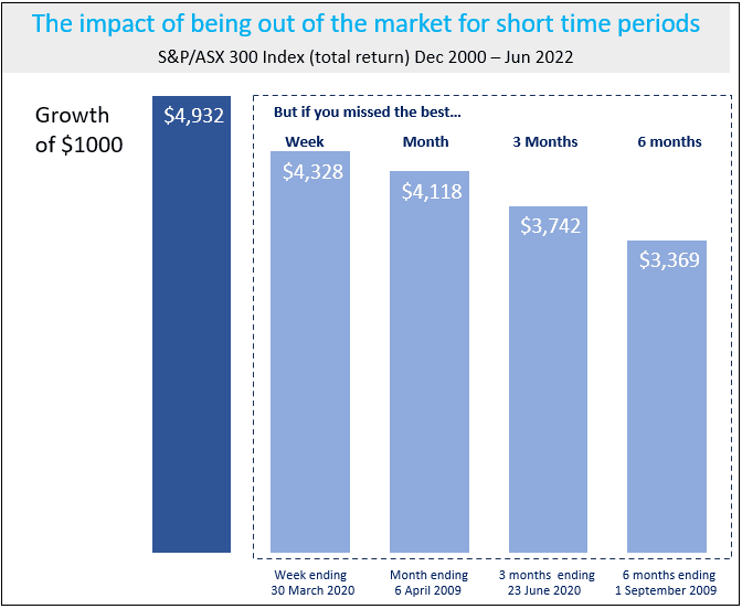 The impact of being out of the market for a short time can be profound, as shown by a hypothetical investment in the stocks that make up the S&P/ASX 300 Index .